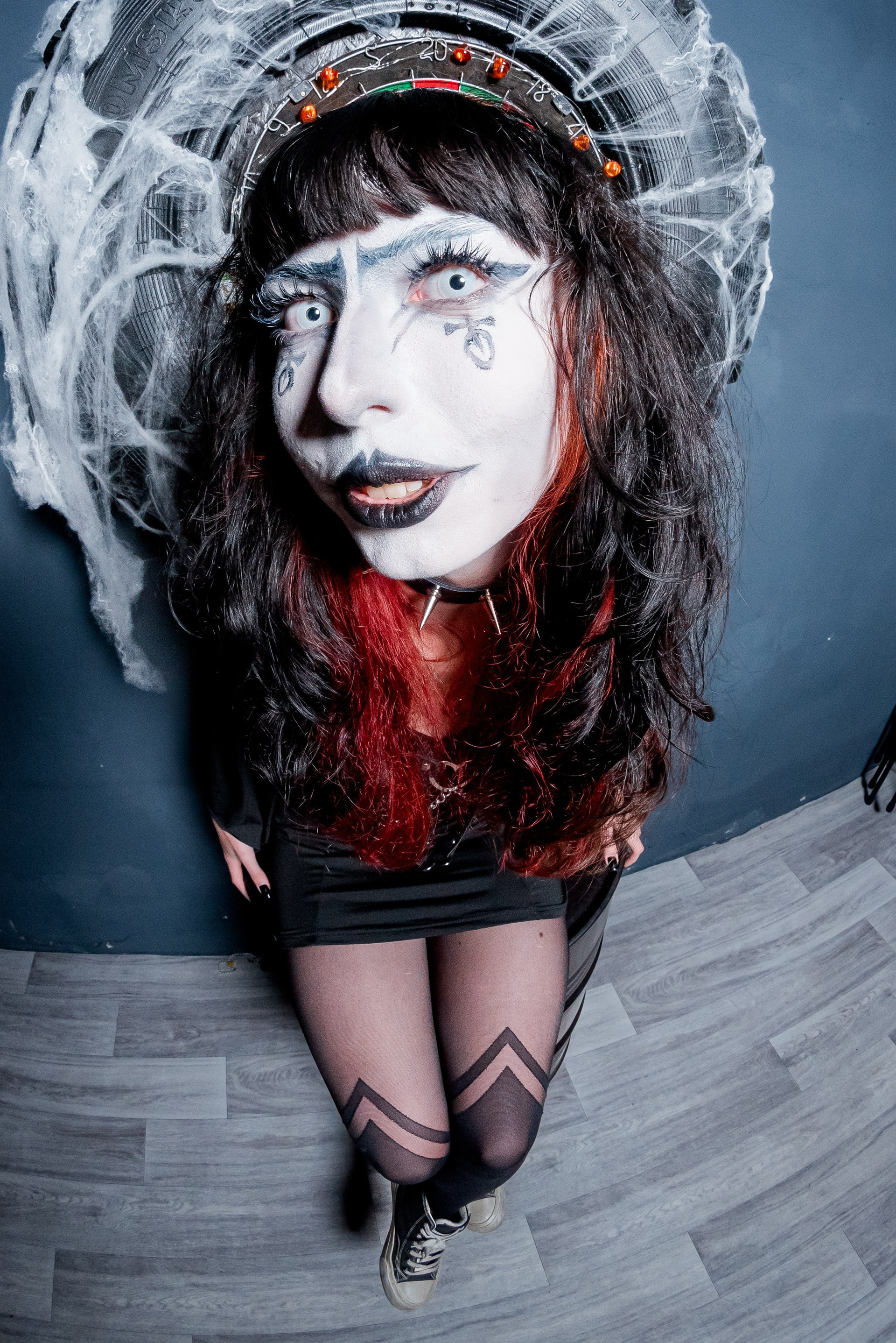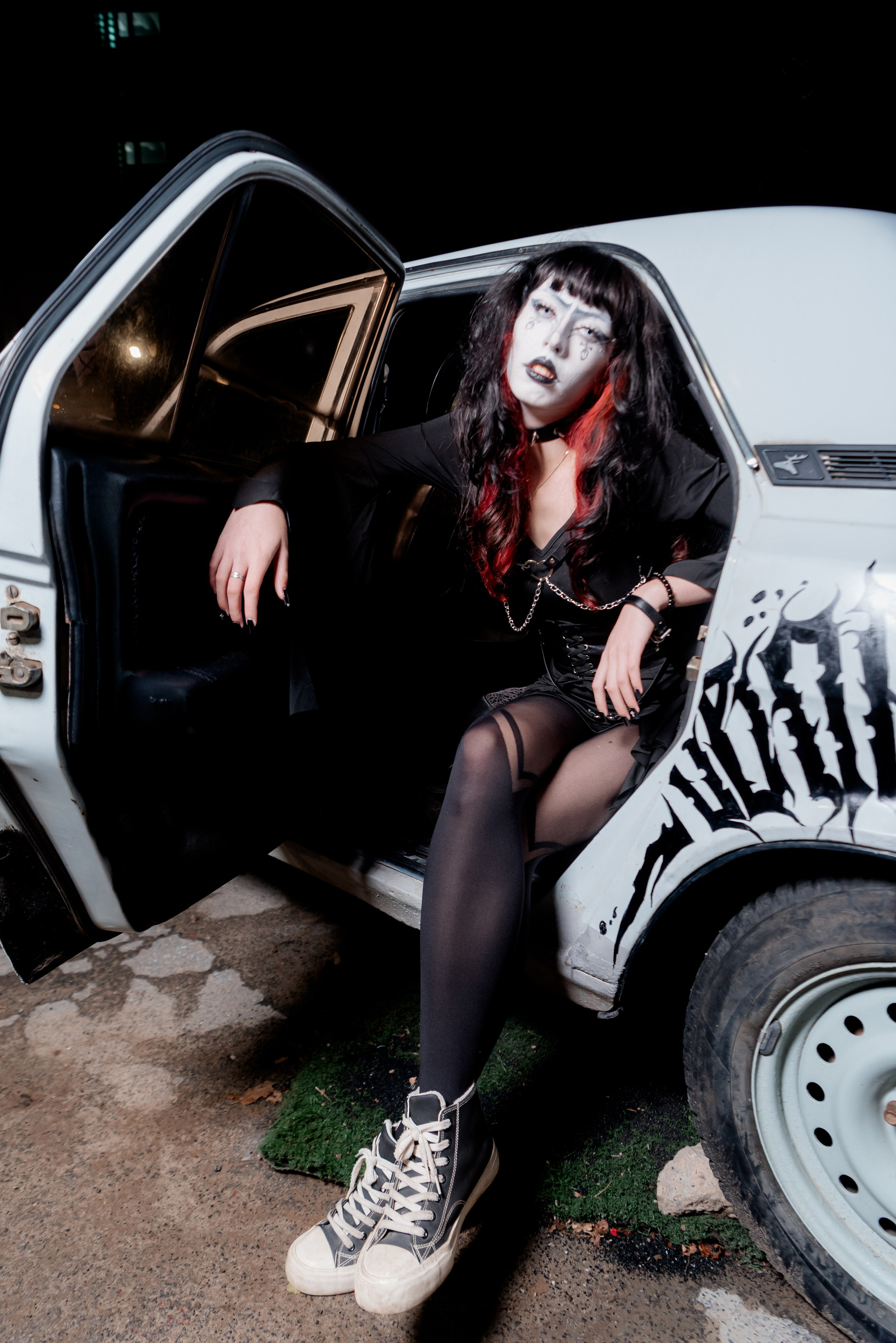 Эта фотосессия — пример того, как можно создать сильные кадры без сложной подготовки. Девушка сама придумала и собрала свой образ в стиле «мертвой невесты» с белым макияжем и графичными линиями.